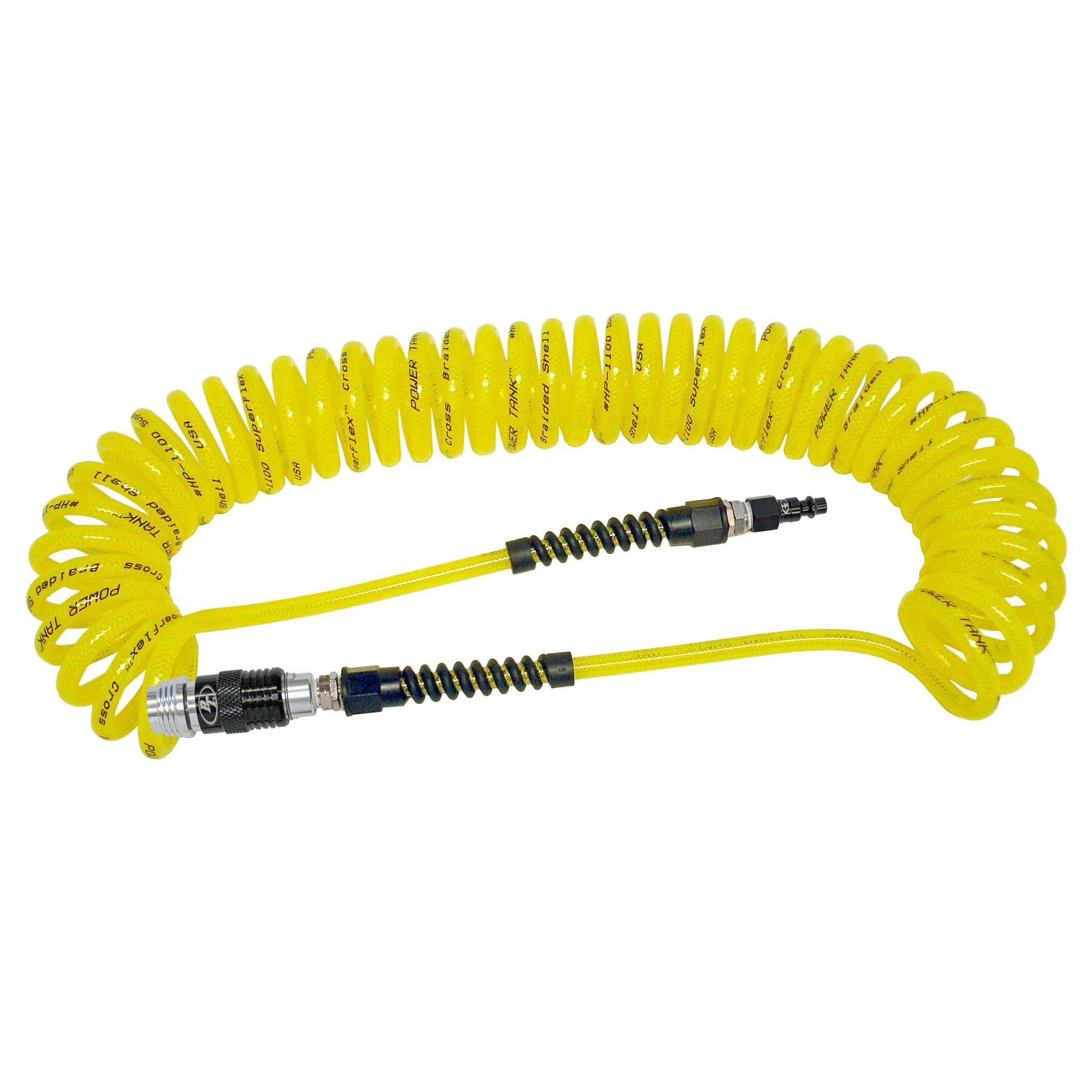 Air Hose 30 ft. Coiled 1/4" NPT Male Thread Yellow. This ultra duty coiled hose is as high tech as a hose can get. It features a co-extruded shell construction which captures a nylon weave between two separate layers of high durometer Durathane material.
