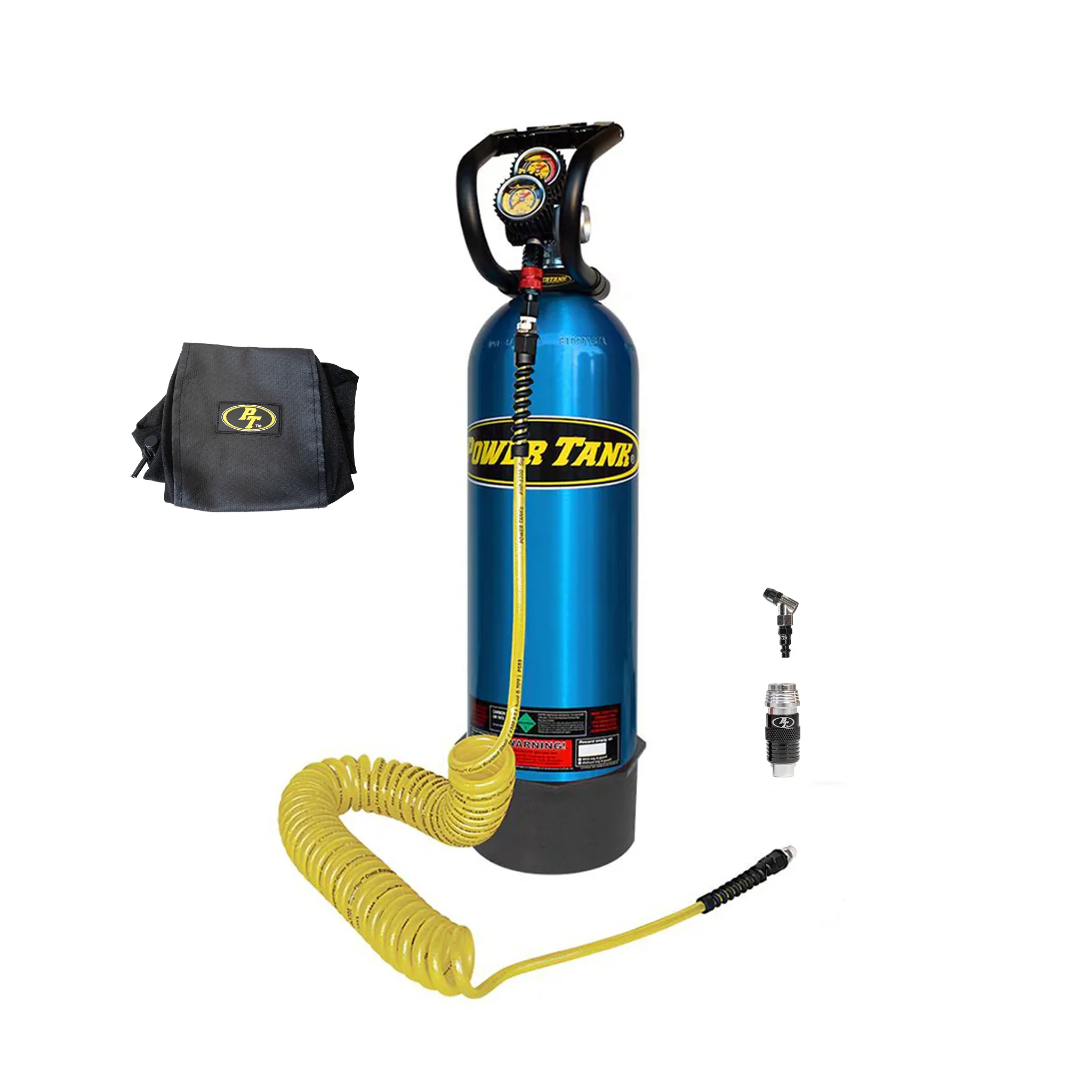 A Power Tank is the fastest and most powerful portable air solution. With the power of CO2 you can air up faster, reseat bigger tires (tested up to 46 in.) safely, and run air tools at full power. To see what Power Tank performance looks like for your tire size, check out our tire air up chart. Based on tire size and amount of air you are adding, it will tell you how many tires you can fill on one tank and how quickly you can do it. As an example, you can air up from 15 psi to 25 psi on a 37 in. tire in 25 sec. and you can air up 42 tires before needing to refill your 15 lb. Power Tank! The same size tank can also remove 540 lug nuts using a 1/2 in. impact wrench before empty. When it's empty, take your tank to a local fire extinguisher service shop, welding supply store, or beverage carbonic shops, and have it refilled for about $15-$30.