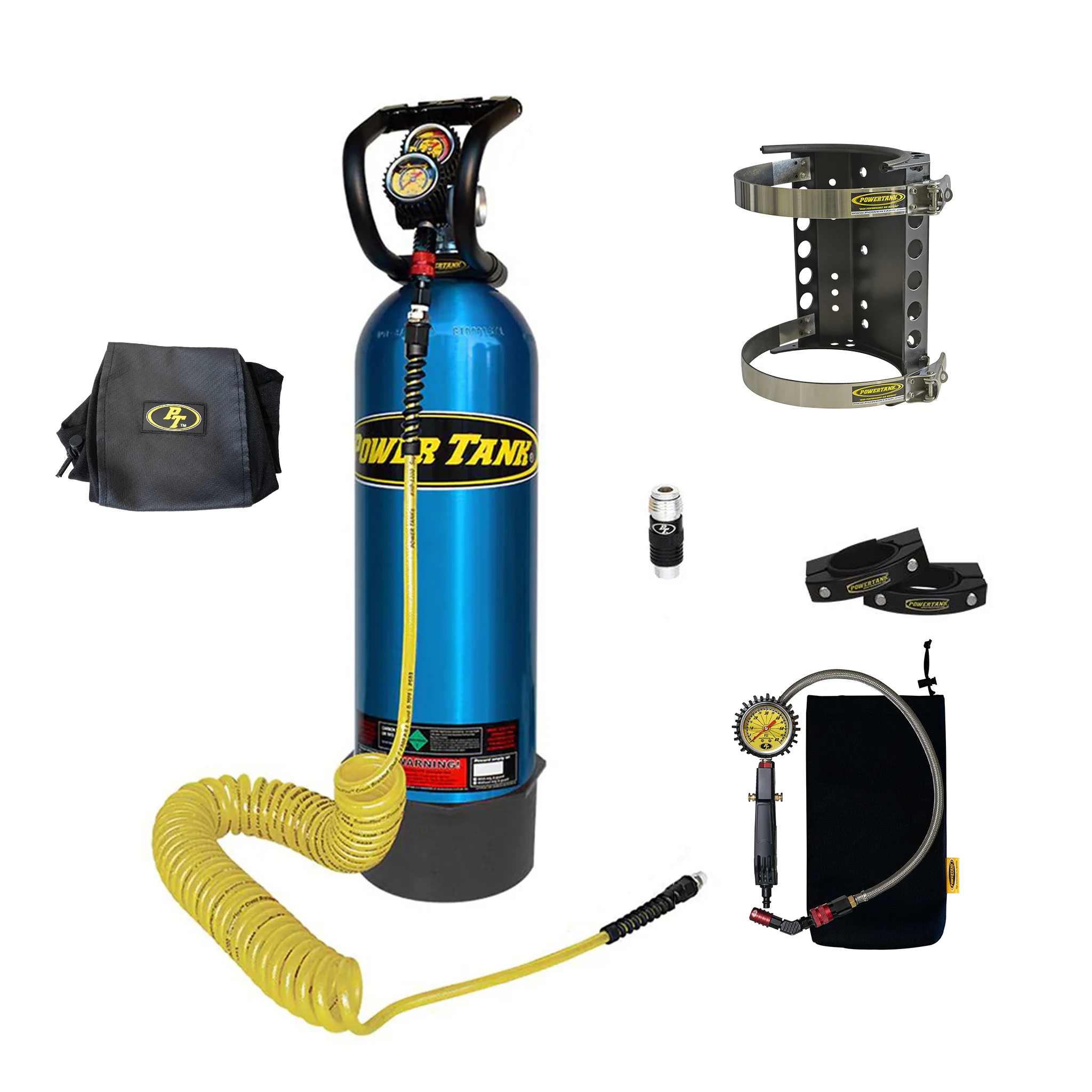 The 15 lb. Roll Bar Edition Power Tank is recommended for 37 in. tires or larger and includes a pair of billet Roll Bar Clamps to easily mount your Power Tank onto your roll bar. Our Roll Bar Clamps fit tubes from 1.5" to 2.5" in diameter so this kit will mount to any roll cage in any vehicle provided there is room to fit. The Roll Bar Edition is based on a Power Tank Package B so you get all the upgrades that come with it like our Super Coupler and a HD Tire Inflator with Gauge to make using air tools and airing up tires a breeze.