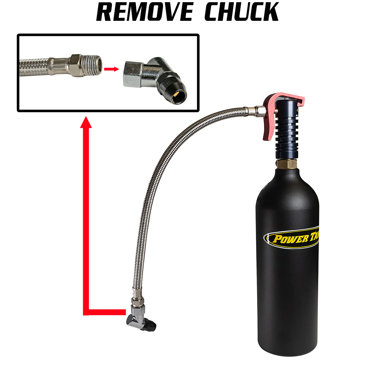 To upgrade your Power Shot, unscrew the air chuck from your trigger and replace it with our Power Flow quick-switch coupler. Add a male plug back onto your air chuck and you have all the same functionality as before with the added ability to switch between different attachments on the fly. Switch from the push-on air chuck to inflate tires and reseat beads, to the Pro Eagle Phoenix CO2 Jack adapter to be able to quickly change a tire in the field or in your garage. You can even disconnect from the jack while it is raised to attach the air chuck and reseat a tire while it's in the air. You can expect over 50 full actuations from the air jack from a single 20 oz. Power Shot bottle.
